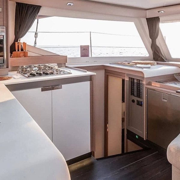 Her inverted bows, her innovative saloon where the chart table adjacent to the entrance gives way to a “total relaxation” lounger, her performances and her habitability combine to make this new model an exceptional catamaran.